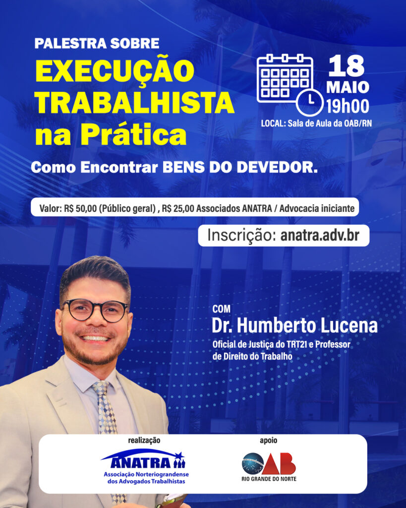 A Associação Norteriograndense dos Advogados Trabalhistas (ANATRA), cumprindo seu compromisso com o aperfeiçoamento técnico da classe, convida a comunidade jurídica para a palestra “Execução Trabalhista na Prática: Metodologias para a Localização de Bens do Devedor”.